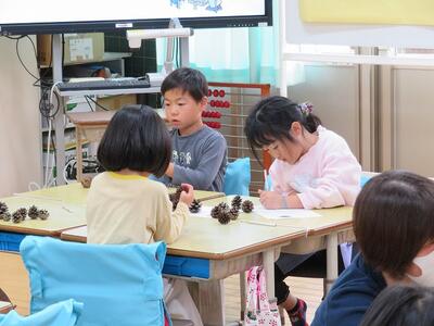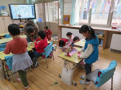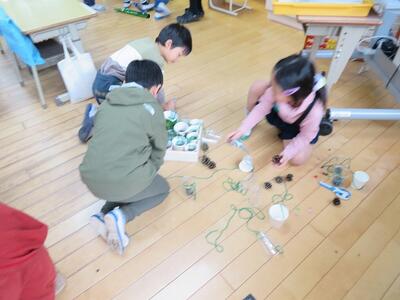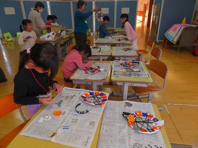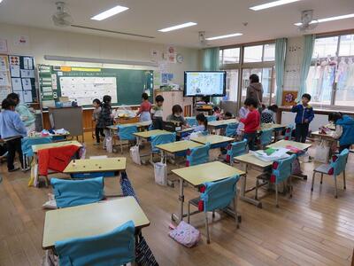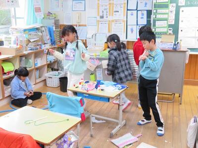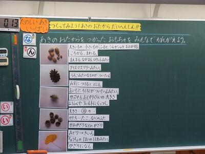 1時間目、1年生生活科、「あきのおたから」を使ったおもちゃづくりが行われていました。保育園の子どもたちに楽しんで遊んでもらうために工夫したおもちゃをつくっていました。