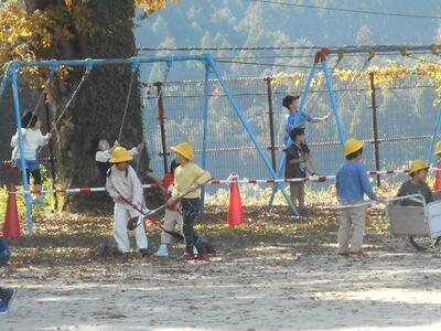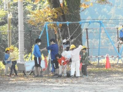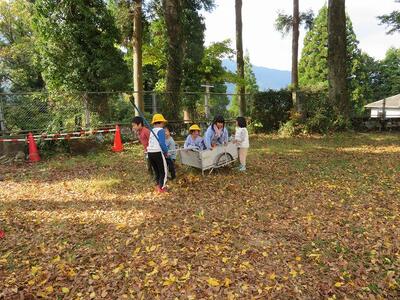 昼休み、今日も外では落ち葉で遊ぶ子どもたち、1年生だけでなく他の学年も楽しんでいました。