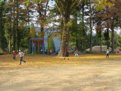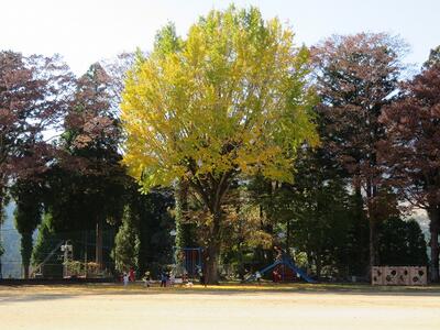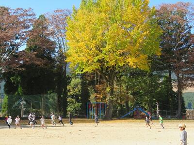 業間、ランランタイム、きれいに黄色に色づいたイチョウ、日光があたると金色にも見えます。子どもたちはイチョウをバックに元気に走っています。