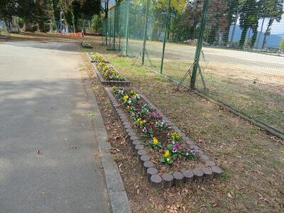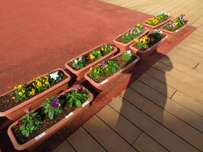 花一杯運動で植えたパンジーとビオラがしっかり根付いてきて、きれいな花を咲かせています。
