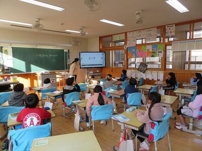 1時間目、2年生ではかけ算の学習が行われていました。かけ算は、2年生算数の大きな山場です。現在2・3・4・5の段を学習し今日は復習をしていました。後半は、5の段の九九ビンゴで楽しく学んでいました。