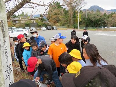 4時間目、4年生は総合的な学習の時間でした。「6.26大水害」について学ぶために水害記念碑を見学に行きました。