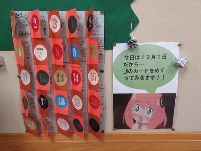 保健室の掲示です。クリスマスにちなんだ掲示です。毎日、カレンダーをめくると健康について学べるようになっています。