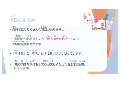 気持ちの種類と役割を学んで、「気持ち(こころ9」「考え(あたま)」「行動(からだ)」のつながりを学びました。
