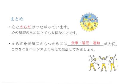 「こころ」と「からだ」はチームであることから、自分の普段の生活を振り返り、「こころ」と「からだ」を健康に保つための方法をクイズ形式で考えました。