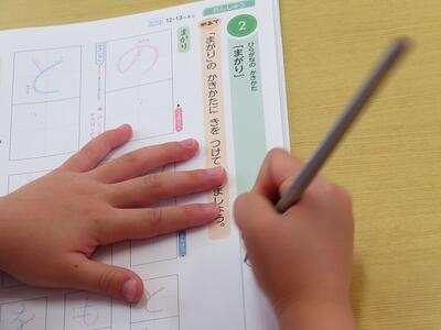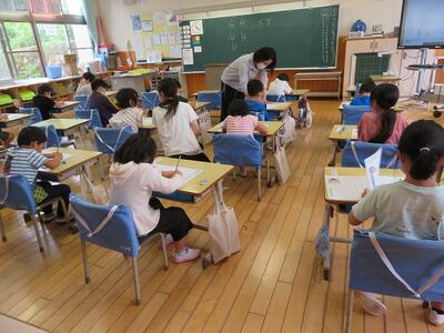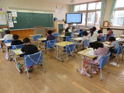 1年生国語の書写、姿勢に気をつけながら、丁寧に書いていました。