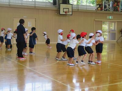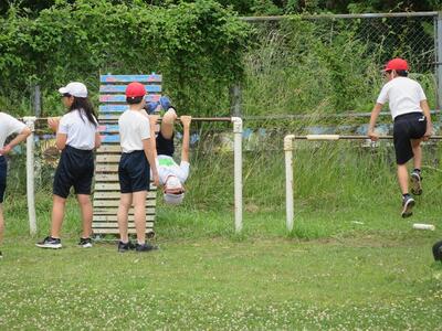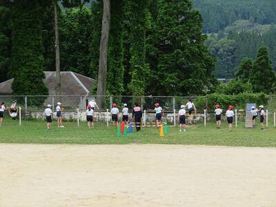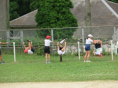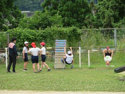 6年生体育、運動場で鉄棒や固定施設を使った学習をしていました。
