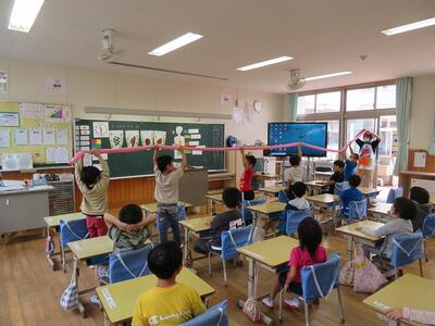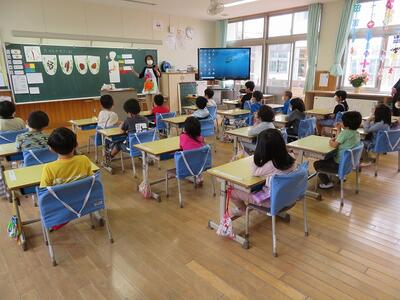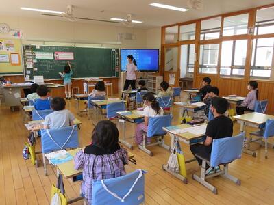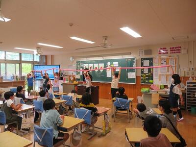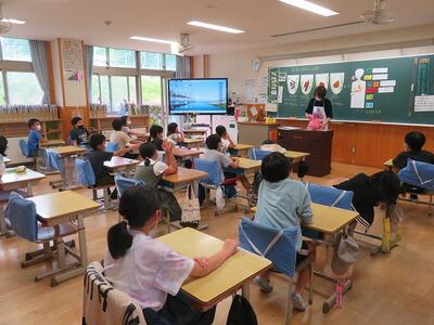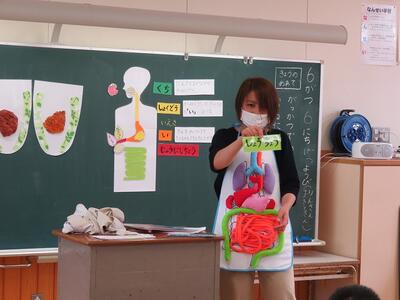 今日、1年生と4年生で「心と体の健康」について考える授業がありました。現在、大学院で勉強されている松本先生に教えてもらいました。1年生は「たべもののたび」、4年生は「うんこは体からのお便り」という内容でした。