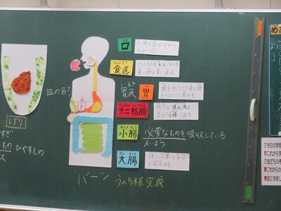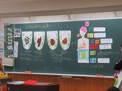 1年生「たべもののたび」は、うんこができるまでのルートを知り、体の素晴らしさに気づくことが目標でした。授業の様子です。