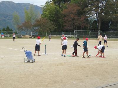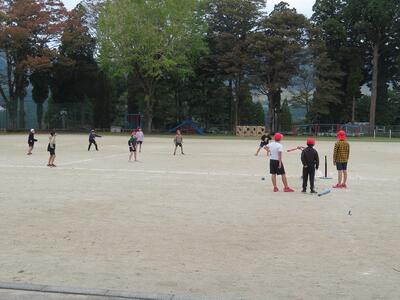 5年生は、外で「ティーボール」が行われていました。2つの場で、ゲームが行われていました。