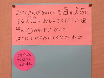 10月になり保健室の掲示物が変わりました。今回の掲示物は国内留学をしている松本先生に作っていただきました。10月10日、「目の愛護デー」にちなんだ掲示物です。