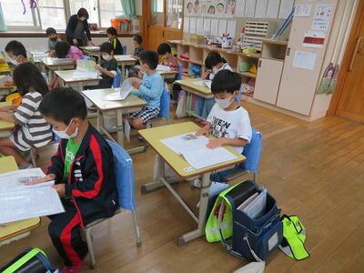 今日は、学習や生活の記録、通知表を渡す日です。今回は4月から9月までの学習や生活の記録です。通知表渡しが5時間目に行われた1年生から3年生の様子です。先生方が一人一人に頑張ったことを伝えながら渡されていました。