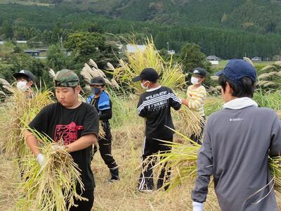 昨日は、稲刈りを体験した後は、田植えからずっとお世話になっている学校運営協議会の北野さんのお話も伺いました。米作りが南阿蘇で始まったときのこと、食糧問題、地球環境問題等々・・・。子どもたちへの熱い思いと期待も伝わりました。