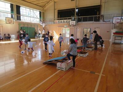 今日の2時間目、3年生と4年生の授業です。3年生は体育、体育館でのマット運動