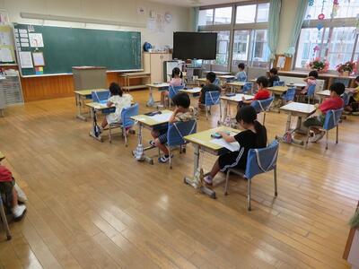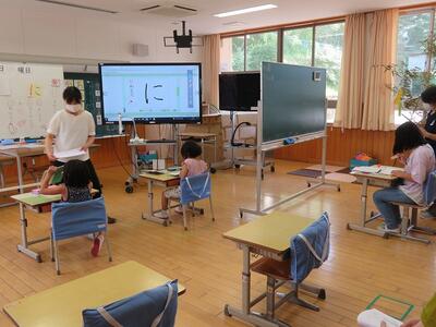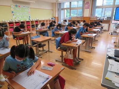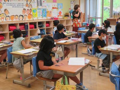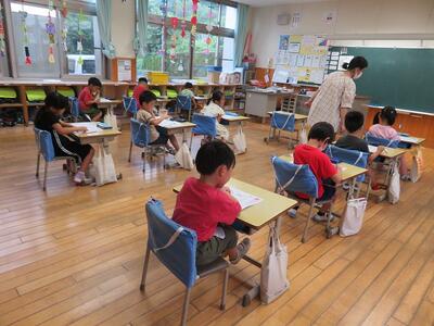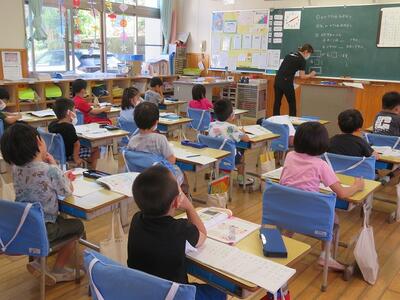 1年生、国語、体育でプールに入る予定でしたが、3時間目だけ雨が強くなり、泳ぐことができませんでした。それでも国語を頑張っていました。