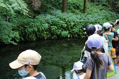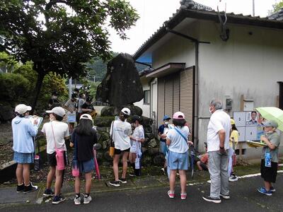 公民館ではゲストティーチャーの川﨑さんからお話を聞きました。川﨑さんは小さい頃白川大水害を体験され、現在も元区長として地域の防災にも関わっておられる方です。公民館では、今も残してある大水害の写真について詳しく説明していただきました。また、水害記念碑にも案内していただきました。