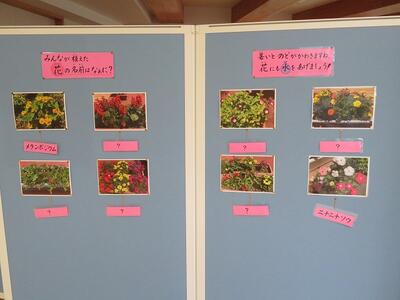6月に各学年で植えた花の名前に関する掲示物です。花の写真の下のカードをめくると花の名前が書かれています。他の学年が植えた花の名前も覚えられるといいですね。