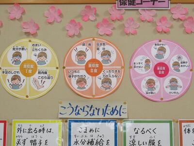 保健室の掲示は、「熱中症の予防」がテーマです。応急手当グッズを倒れた子どものイラストに貼りながら、応急手当が学べる楽しい掲示物です。