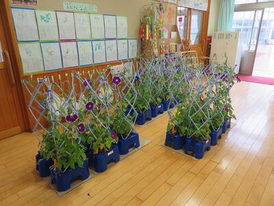 雨はよく降りましたが、学校では台風の影響はほとんどなくほっとしました。1・2年生は、朝顔とミニトマトを室内に避難させていました。ずいぶん大きくなっています。