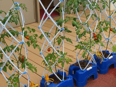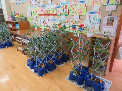 ミニトマトは赤い実がついた子、たくさん実がついた子、生長が分かり楽しそうでした。
