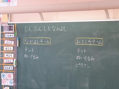 2年生、図工、新聞紙を使って造形遊び、グループで協力して楽しそうでした。