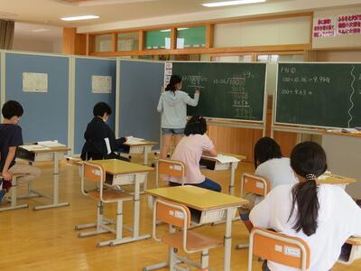6年生、算数、2つのグループ、少人数に分かれての学習、速さの問題にちょっと苦戦していました。