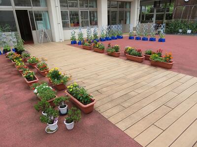 暑くなったとたん、花いっぱい運動で植えられた花が元気になっています。職員玄関前の花々もきれいに咲いています。