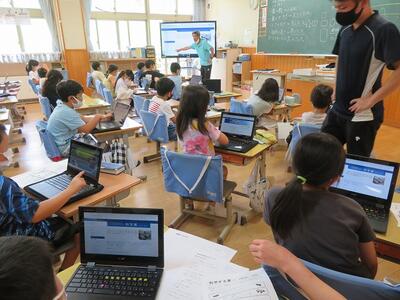 3年生、理科、夏休みの自由研究の説明、タブレットを使って、県教育センターの科学展のページでどんな研究があるのか見ていました。