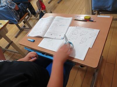 5年生、算数、図形の学習、実際に操作をしながら調べていました。