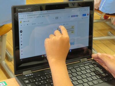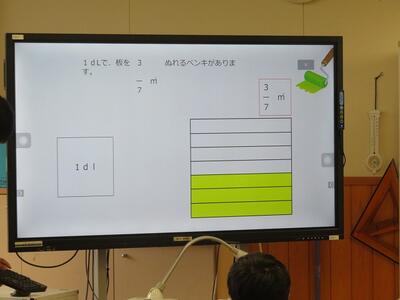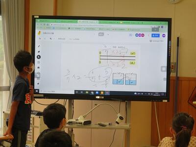 考えた答えは、タブレットで写真に撮っていました。みんなの考え方(写真)が電子黒板に転送され、いろいろな答えの出し方を共有しました。