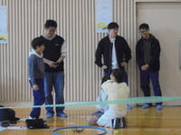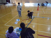 フラフープの輪から出発して、支柱に結ばれたスズランテープの間や上を通って、宙返りして、また、フラフープの輪に戻ってくるようにプログラミングをします。