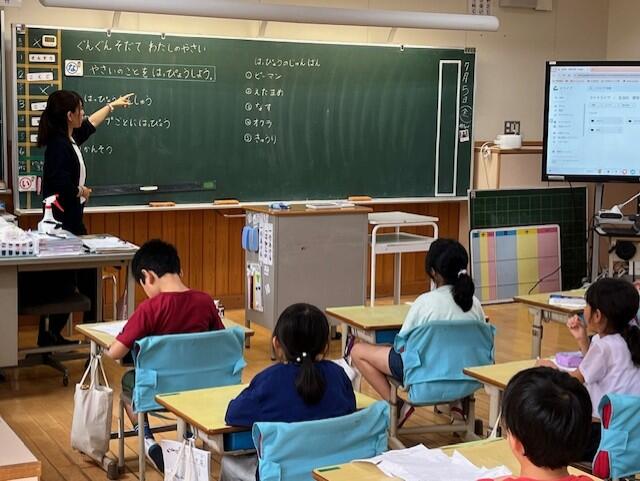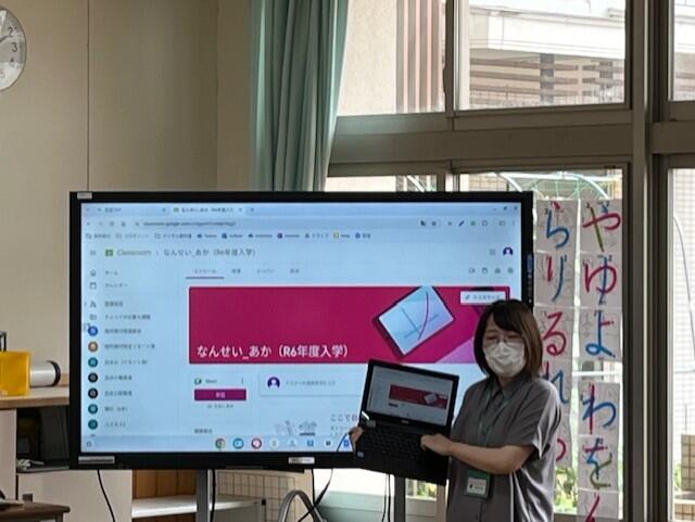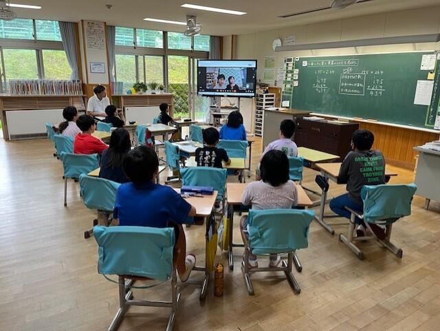 学校の隣にある学童教室から歩いてそれぞれの教室に入り、リモートでつながっている子どもたちと一緒に元気よく健康観察をしています。