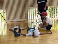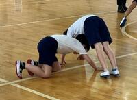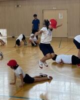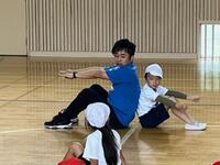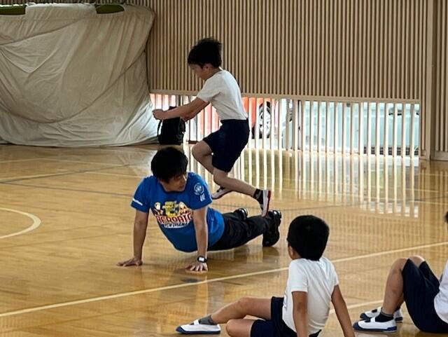 子どもたちは、すぐさまマネをして、くぐって跳んで、くぐって跳んでを繰り返していました。大村先生の運動は、どれもわかりやすく、子どもたちが楽しんでできるように工夫されています。