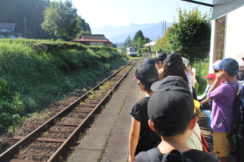 大津町にある「イオン大津店」へ行くために、加瀬駅から南阿蘇鉄道を利用しました。列車の到着を、みんなで待っています。