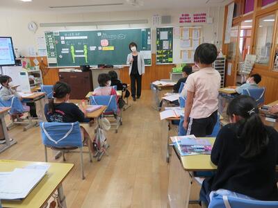 2時間目に2年生算数の研究授業が行われました。2年生の教室に先生方が集まりました。今年度初めての研究授業でした。授業の内容は、「ひき算のしかたを考えよう」というところで、繰り下がりの筆算の仕方を考える学習でした。