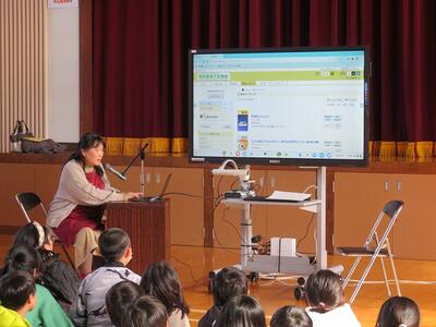 4・5・6年生は、体育館でループ南阿蘇の職員さんによる読み聞かせ「南阿蘇村の神話」とタブレット図書館利用のお話を聞きました。