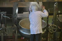 大きな鍋を大きなしゃもじでかき混ぜたり、野菜を鍋に入れたり、