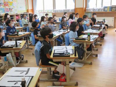 3年生書写、毛筆でした。筆の運び方を教えてもらい、上手な字が書けるようになっていました。