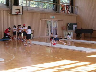 4年生、体育館での体育、マット運動でした。後転系の技にチャレンジしていました。連続した開脚後転にチャレンジしている子もいました。