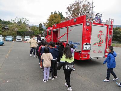 避難訓練が終わった後、1年生から4年生が救急車と消防車を見せてもらいました。消防署の方が、たくさんの質問にも丁寧に答えて下さいました。消防車輌の見学は、毎回させてもらっていますが、いつも興味深く見学する子どもたちです。