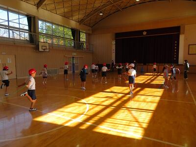 業間、ランランタイム、きれいに黄色に色づいたイチョウ、日光があたると金色にも見えます。子どもたちはイチョウをバックに元気に走っています。