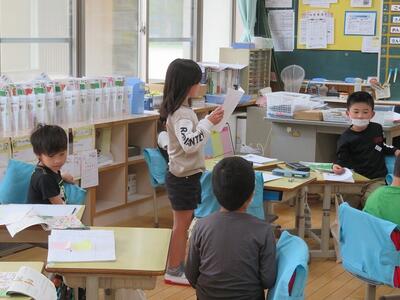 2時間目、2年生国語の授業です。「だいじなことをおとさずにはなしたりきいたりしょう」という勉強です。「迷子さがし」を通して、複数の情報の中から大事な情報を選んで話したり,話の中で大事なことを落とさずに聞いたりする能力を身に付けさせることねらいとしています。授業の様子です。