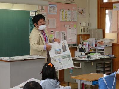 5年生は、国語や社会、総合等で新聞記事を活用することがあります。その事前授業として、熊日新聞の記者さんから新聞の読み方を教えていただきました。途中からは、子ども用に作られた記事をタブレットで読んでみました。ネット上にはいろいろな情報がたくさんある中、正しい情報を取捨選択する力は大事です。タブレットで新聞を読みながら、新聞が公共性の高い資料ということが子どもたちにも分かったようでした。