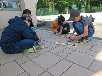 1時間目、5年生が石に絵や文字などを楽しそうに描いていました。