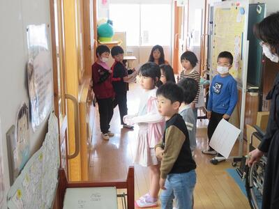 2時間目、1・2年生が学校探検をしていました。今日は、2年生が1年生を案内し、各教室のことを教えていました。1年生もしっかり聞いていました。