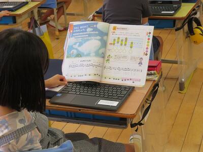 1年生、国語、体育でプールに入る予定でしたが、3時間目だけ雨が強くなり、泳ぐことができませんでした。それでも国語を頑張っていました。