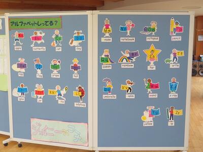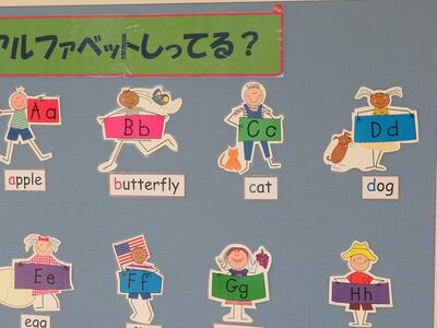 英語の掲示物です。アルファベットが書かれています。イラストが外国を感じさせます。