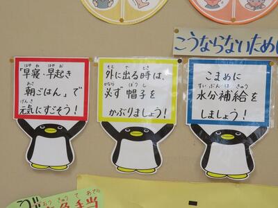 保健室の掲示は、「熱中症の予防」がテーマです。応急手当グッズを倒れた子どものイラストに貼りながら、応急手当が学べる楽しい掲示物です。