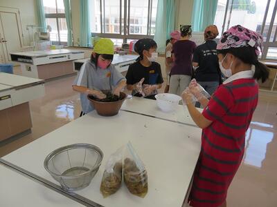昨日(30日)、4年生では、1学期に漬けていた梅をシソと漬けるカリカリ梅作りを行いました。1学期もお世話になった野田さんが育てられたシソをもみほぐす作業をみんなで行いました。家庭科室はシソのいい香りでいっぱいでした。