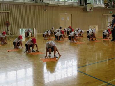 1年生は体育館での体育。楽しく走っていました。